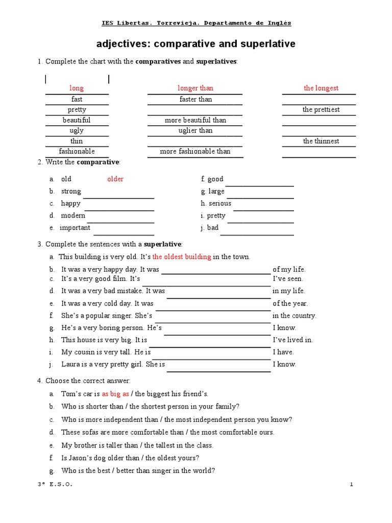 Comparatives and Superlatives of Adjectives Write the ... from imgv2-2-f.scribdassets.com When we talk about the superiority of an adjective, we use superlative adjectives. If you're unsure, you have to watch this english grammar lesson! An adjective, when used for comparison, is used in two forms: It was the best day of my life. The comparative form of an adjective is used for comparing two people or things (e.g., he is taller than me), while the superlative is used for comparing one person or thing with every other member of their group (e.g., he was the tallest boy in. Superlative adjectives, such as biggest or best, compare one person or thing against a whole group. Recursos cheat sheets adjectives list of comparatives and superlatives. We use comparatives and superlatives to compare two or more nouns.